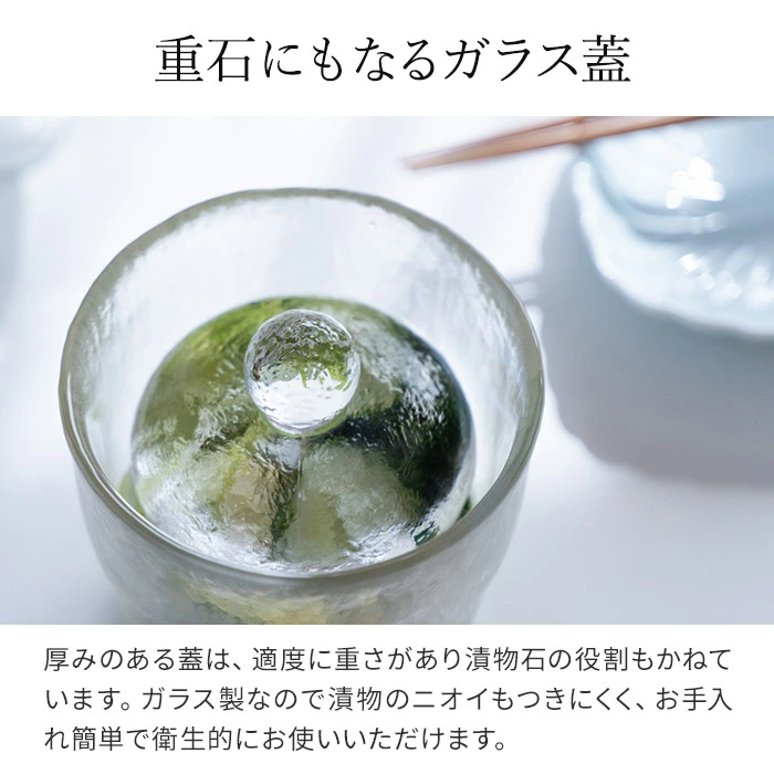切った野菜と調味料を入れて、ふたを閉じるだけ。冷蔵庫で待つ時間も、どこか静かで心地よく感じられます。ガラス製の本体は中身が見えて、漬かり具合がひと目で分かるのが魅力。におい移りや色移りもしにくく、清潔に使えます。重みのあるふたがほどよく押しを効かせ、特別な技がなくても味がなじみやすい設計。きゅうりや大根はもちろん、ミニトマトや季節の野菜にも相性抜群です。シンプルで美しい佇まいは、そのまま食卓に出しても絵になる存在。忙しい日常の中でも、手軽に「ちゃんとおいしい」を叶えてくれる一品です